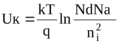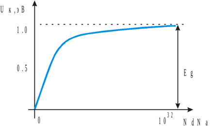Таким образом потенциальный барьер в pn переходе тем выше, чем сильнее легированы p и n области. Соответствующая зависимость Uк от степени легирования областей показана на рис. 2.8.