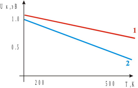 Рис. 2.9. Зависимость контактной разности pn перехода от температуры при разном уровне легирования областей (Si - кривая 1: NdNa=1032 , кривая 2: NdNa=1028)