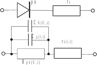 В принципе кривые рис. 2.20 можно объяснить представив диод в виде эквивалентной схемы, состоящей из последовательно включенного pn перехода и резистора rs рис. 2.21 а. При этом сам переход можно представить в виде некоторого нелинейного, зависящего от напряжения резистора и емкости, которая включает барьерную и диффузионную емкости pn перехода. При этом значения как барьерной, так и диффузионной емкости зависят от напряжения и времени (2.89, 2.95 и рис. 2.18). Сопротивления толщи p и n областей зависят от концентрации свободных носителей заряда, поскольку инжекция приводит к увеличению их концентрации, сопротивление rs должно зависеть от величины тока инжекции и от времени, поскольку инжектированные носители диффундируют вглубь материала с конечной скоростью.