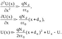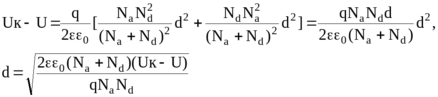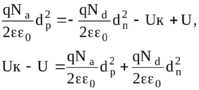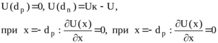 За ширину ОПЗ будем считать область от -dp до dn на границах которой напряженность электрического поля принимает нулевое значение, потенциал левой (p) области примем равным нулю, тогда потенциал правой области будет Uк - U, где U - внешнее напряжение, смещающее переход в прямом направлении (U > 0). Таким образом для граничных условий можем записать: