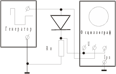 На рис. 2.19 показана электрическая схема, которая может быть использована для изучения переходных характеристик диода, обусловленных свойствами pn перехода. Для задания напряжения произвольной формы на диоде служит импульсный генератор. Регистрация сигналов осуществляется двухканальным осциллографом. Напряжение на диоде регистрируется дифференциальным входом U. Ток регистрируется по падению напряжения на малом сопротивлении Rи, напряжение с которого подается на асимметричный вход осциллографа I. Сопротивление Rи много меньше сопротивления толщи баз диода и не оказывает существенного влияния на переходные процессы.
