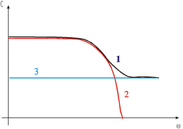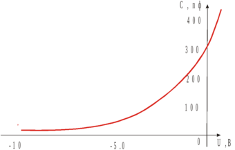 Как видно из графика емкость pn перехода может изменяться в значительных пределах, что позволило использовать это свойство в управляемых напряжение полупроводниковых емкостях - варикапах см-3. В варикапах используется обратное включение диода, поскольку при прямом включении через барьер идети значительный ток и добротность емкости оказывается маленькой.