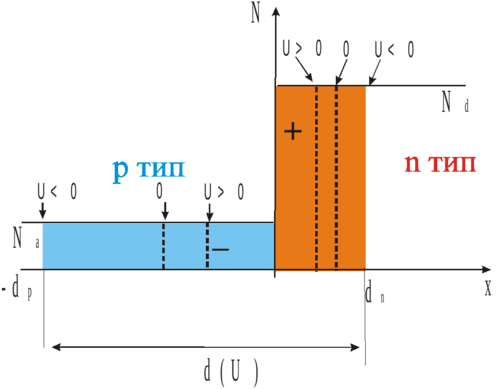 Величина емкости pn перехода зависит от приложенного к переходу напряжения. Из (2.81) следует, что зависимость емкости от напряжения будет иметь место только в том случае, если от приложенного напряжения будет зависеть толщина перехода d(U). Рассмотрим какие явления приводят к зависимости d(U).