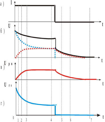Рис. 2.20. Форма сигналов, характеризующих переходные процессы в структуре с pn переходом: а) ток через структуру, б) напряжение на структуре, в) напряжение на pn переходе, г) напряжение на сопротивлении толщи.