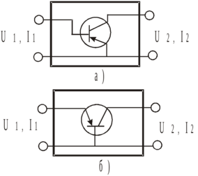 Рис. 3.10. Представление транзистора в виде четырехполюсника: а) включение с общим эмиттером, б) включение с общей базой