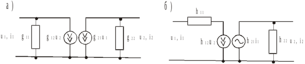 Рис. 3.12. Схемы замещения биполярного транзистора соответствующие: а) g - параметрам, б) h - параметрам