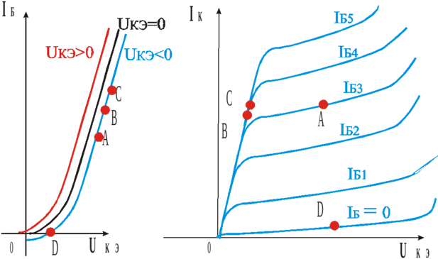 Вольтамперные характеристики для схемы ОЭ показаны на рис. 58 на графиках обозначены точки соответствующие точкам на вольтамперных характеристиках для схемы ОБ (рис 3.6) . Следует обратить внимание, что для режима насыщения характеристики не заходят в третий квадрант, т.е. напряжение Uк. не изменяет знак. Действительно в ОЭ: Uкэ. = Uкб - Uэб 0, Uэб > 0 и Uэб > Uкб. К отличиям от ОЭ следует так же так же отнести то, что тепловой ток I*к0, измеренный при Iб = 0, в (β+1) раз больше, чем ток Iк0, измеренный при Iэ = 0. В ОЭ менше выходное сопротивление транзистора по сравнению со схемой ОЭ (меньше наклон выходных ВАХ).