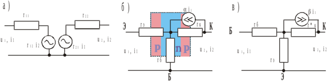 К недостаткам физических параметров следует отнести то, что их нельзя непосредственно измерить и значения для них получают пересчетом из r - параметров. Для нахождения формул пересчета можно составить уравнения описывающие схему рис. 3.11а и схему рис. 3.11б (или рис. 3.11в) и приравнять коэффициенты при соответствующих токах.