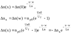 Чтобы найти электронную составляющую тока коллектора следует рассмотреть область коллектора (x > w). В p область коллектора из n-базы будут инжектироваться электроны. Так же как и для эмиттера будем считать, что толщина коллектора много больше диффузионной длины неосновных носителей Ln , тогда как и в предыдущем случае можно воспользоваться решением, полученным при анализе процессов в pn переходе (51):