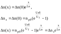 Теперь, чтобы найти электронную составляющую тока эмиттера рассмотрим область эмиттера (x < 0). В p область эмиттера из n-базы будут инжектироваться электроны. Будем считать, что толщина эмиттера много больше диффузионной длины Ln , тогда мы можем воспользоваться решением для распределения инжектированных носителей, полученным при анализе процессов в pn переходе (51):