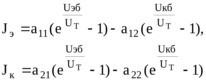 Если из верхнего уравнения (4_87) выразить (eUкб/Uт-1) и затем подставить полученное значение в нижнее в нижнее уравнение (4_87) и выполнить преобразования аналогичные только что рассмотренным можно получить уравнения для других параметров, описывющих транзистор: αI и iэ0. Однако можно не делать эти преобразования, а воспользоваться следующим рассуждением: поскольку транзистор структура симметричная, чтобы получить нужные коэффициенты в уравнениях (4_90) достаточно поменять индексы - к и э, 1 и 2. Тогда: