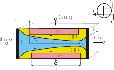 В полевых транзисторах с управляющим переходом (ПТУП) для изменения проводимости канала используется эффект изменения ширины области пространственного заряда (ОПЗ) обратно смещенного перехода при изменении приложенного к нему напряжения затвора. На рис. 76 показана конструкция n - канального транзистора, в котором для управления используется обратносмещенный p+n переход.
