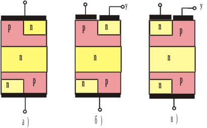 ис. 75. Конструкции семисторов: а) неуправляемый, б) управляемый отрицательным импульсом, в) управляемый положительным импульсом.