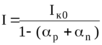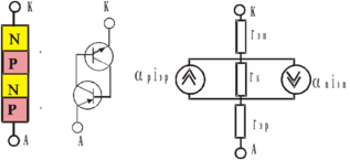 Для токов электронного и дырочного токов коллекторного перехода можно записать: Iкp = αpIэp = αpIа, Iкn = αnIэp =αnIкат, где Iкp, Iэp, Iкn - соответственно управляемые дырочные и электронные токи эмиттера и коллектора, αp и αn коэффициенты передачи тока соответственно для pnp и npn транзисторов, Iа, Iкат - токи анода и катода (в рассматриваемом случае Iа = Iкат = I) . Общий ток тиристора I, будет включать как управляемые токи, так и тепловой ток коллекторного перехода Iк0: I = αpIа + αnIк+ Iк0 = Iк0 + (αp+ αn) I.
