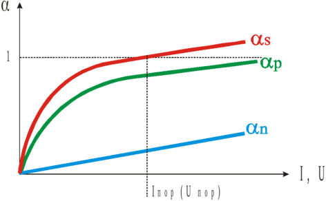 то ток тиристора стремится к бесконечности. Таким образом (5_2) и будет условием включения тиристора. На рис. 74 показаны зависимости коэффициентов αp, αn и αS = (αp + αn) от тока через тиристор. Поскольку ток определяется напряжением на тиристоре, аналогичная зависимость будет если использовать в качестве аргумента напряжение. При этом моменту включения тиристора будут соответствовать значения некоторого порогового тока и напряжения: Iвкл, Uвкл. Изменяя характер зависимости αp(I) или αn(I) возможно изменять значения тока и напряжения, при которых происходит переход тиристора в состояние с малым сопротивлением.