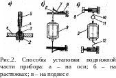 одвижная часть прибора снабжается осью или полуосями, которые оканчиваются запресованными в них стальными кернами. Последние опираются на корундовые или рубиновые подпятники (Рис.2,а). Трение керна о подпятник снижает чувствительность и точность прибора, поэтому подвижную часть устанавливают на растяжках или подвесах (Рис.2,б,в).