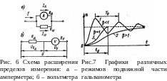 Гальванометры разделяются на переносные и стационарные. Подвижная катушка у переносных гальванометров крепится на растяжках; внутреннее отсчетное устройство снабжено оптическим указателем. Стационарные (зеркальные) гальванометры выполняют с подвесом рамки (катушки) и внешней шкалой, на которую падает луч света, отраженный от зеркальца (Рис.2,в). Легкая катушка и малый удельный противодействующий момент создает условия для возникновения механических затухающих колебаний подвижной части гальванометра (Рис.7, кривая 1). Для убыстрения затухания колебаний применяют электромагнитное успокоение. Коэффициент успокоения (9)