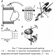 Узел для создания вращающего момента (рис.7,а) состоит из плоской или круглой катушки, по которой протекает измеряемый ток, и сердечника, закрепленного на оси указателя.