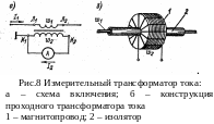 ервичная обмотка трансформатора тока содержит малое число витков и включается последовательно в разрыв цепи (рис.8, а). Вторичная обмотка с большим кольчеством витков соединяется с амперметром на 5 А (иногда на 1 А). Трансформаторы тока выпускаются для работы с первичным током от 5 А до 15кА. При больших значениях тока первичная обмотка представляет собой прямоугольный отрезок шины или стержень, проходящий через окно магнитопровода (рис.8, б). Сопротивления амперметров малы, поэтому нормальным режимом работы трансформатора тока является режим, близкий к режиму короткого замыкания.
