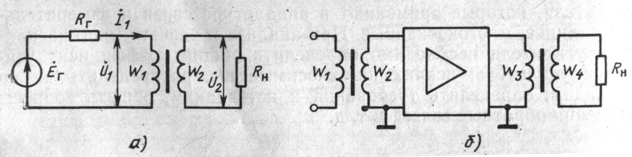 При использовании согласующих трансформаторов пересчитанное сопротивление нагрузки в первичную обмотку R’1=Rнn2, где п— коэффициент трансформатора, т. е. отношение витков первичной обмотки к вторичной (рис. 2,а).