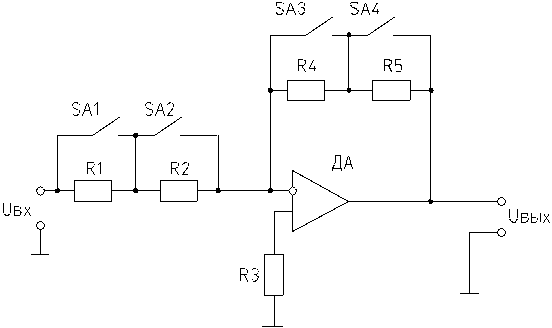 Здесь сопротивление Rвх может принимать значение сопротивления R1 либо R2, либо R1+R2 в зависимости от того, замкнуты или разомкнуты ключи SA1 и SA2.