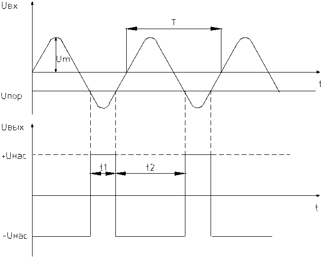 Зная закон изменения входного сигнала и параметры элементов схемы компаратора, можно определить временные параметры выходного сигнала t1 и t2 на рис. 4.