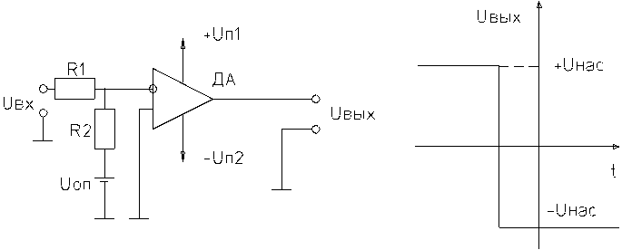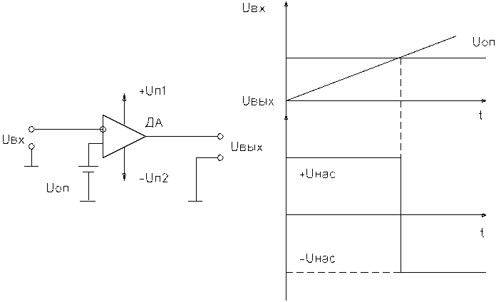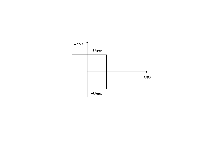 При подаче на один из входов ОУ входного, а на другой — опорного напряжений, момент их равенства отмечается компаратором сменой уровня напряжений на выходе с “+Uнас” на “-Uнас” или наоборот (см. Эпюры на рис. 1). Передаточная характеристика приведенного компаратора представлена на рис. 2.