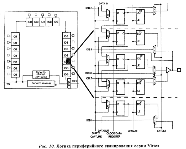 На Рис. 10 показана логика периферийного сканирования кристаллов серии Virtex. Логика периферийного сканирования состоит из 3-разрядного регистра данных на один БВВ, контроллера порта ТАР и регистра команд с декодированием.