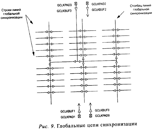В микросхему встроено четыре глобальных буфера, два — в середине верхней части микросхемы, два — в середине нижней части. Эти буферы через первичные глобальные сети могут подводить сигналы синхронизации на любой тактовый вход.