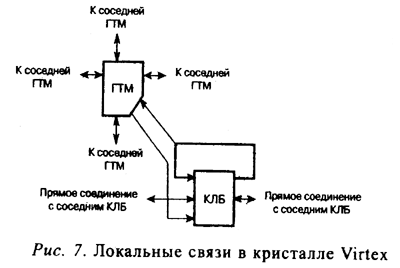 Как показано на Рис. 7, в кристалле Virtex созданы локальные трассировочные ресурсы, называемые VersaBlock. Они позволяют реализовать три типа соединений: