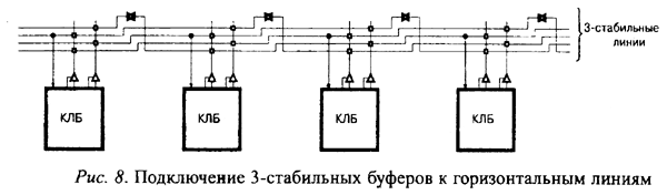 • Горизонтальные трассировочные ресурсы создавались для реализации микросхеме шин с тремя состояниями. Четыре разделенные линии шин реализованы для каждой строки КЛБ, позволяя организовывать сразу несколько шин в пределах одной строки (Рис. 8).
