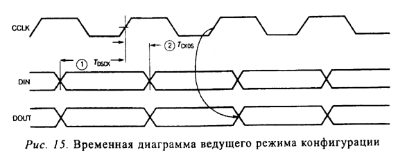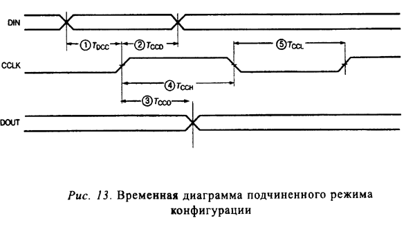 Данные последовательного битового потока (bitstream) должны быть установлены на входе DIN незадолго до появления нарастающего фронта сигнала, генерируемого внешним источником и подаваемого на вход CCLK.