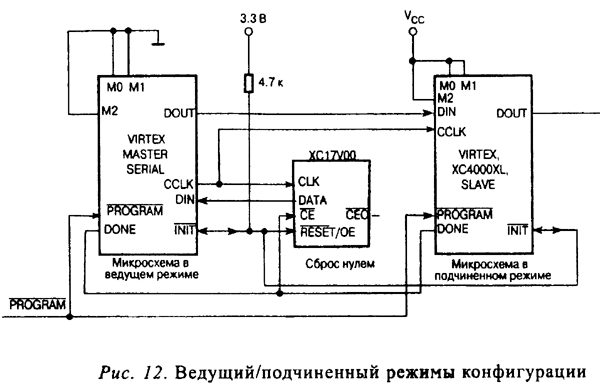 На Рис. 12 изображена полная схема, совмещающая подчиненные режимы и ведущий режим. FPGA Virtex, конфигурируемые в подчиненном режиме, должны быть подключены так же, как устройство, изображенное третьим слева.