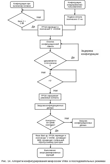 Для последовательного конфигурирования микросхем FPGA необходимо использовать последовательность, изображенную в виде алгоритма на Рис. 14.