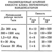 Некоторые из блоков КПЕ имеют встроенные в корпус шариковые верньеры, которые обеспечивают замедление вращения оси роторов в 2,5—3 раза относительно секции пластин ротора. Первоначально блок переменных конденсаторов выбирают по справочникам радиодеталей, выпускаемых промышленностью, а также по данным, приведенным в описаниях промышленных и любительских радиоприемников. Для предварительной ориентировки при выборе блока переменных конденсаторов его крайние емкости следует брать в пределах, указанных в таблице1. При этом рекомендуется за исходную брать минимальную частоту диапазона или самого низкочастного поддиапазона.