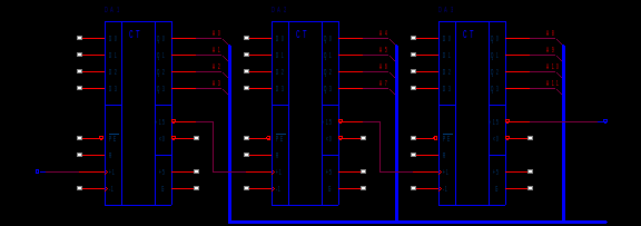 Для реализации схемы подсчета тактовых импульсов используем счетчики К155ИЕ6. В этих счетчиках имеется возможность последовательного подключения с целью увеличения разрядности. При этом выход «>15» подключается к тактовому входу следующего счетчика. Для получения на выходе 12 разрядного двоично-десятичного кода требуется 3 счетчика К155ИЕ6. Вывод переноса последнего счетчика используем для индикации ошибки.