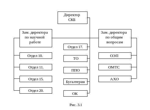 Расмотрим организационную структуру предприятия на примере СКБ «Молния» рис. 3.1. СКБ «Молния» состоит из совокупности функционально связанных отделов: отдел системных разработок, двух отделов схемных разработок ( один из которых занимается схемотехническими решением для аппаратуры систем связи), отдел конструирования РЭА, а также отдел опытного-эксперементального производства, техническийотдел (испытания выпускаемой продукции на надёжность и стойкость), отдел технической документации, служба нормоконтроля (проверка соответствия чертежей разрабатываемой продукции установленным ГОСТам), отдел стандартизации и метрологии (метрологическая экспертиза). Отдельной совокупностью выступают административно-управленческие отделы СКБ: бухгалтерия, отдел кадров, административно-правовой отдел.