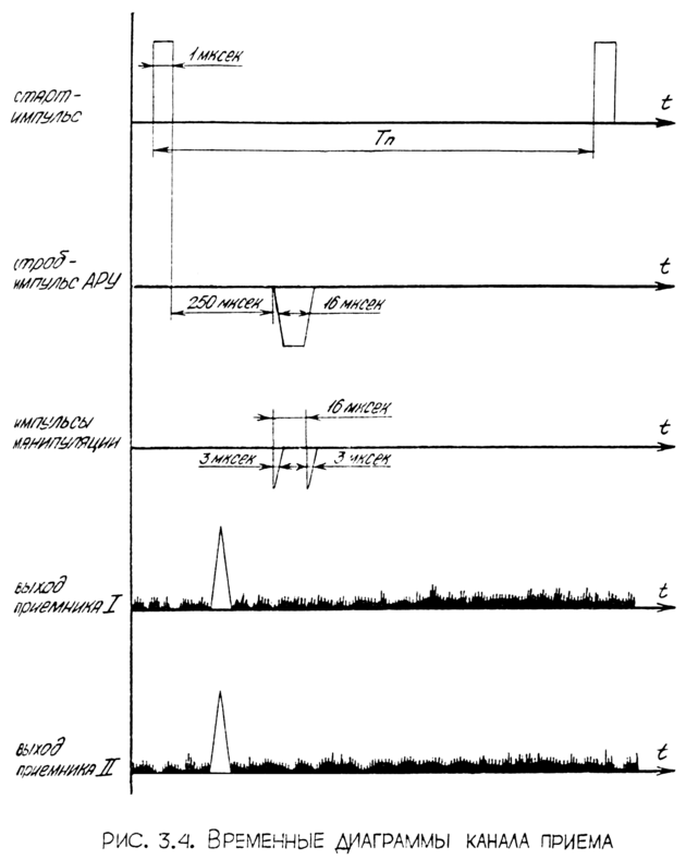 В связи с необходимостью иметь достаточно стабильный уровень шумов приемных каналов. В каждом приемном канале применена система инерционной автоматической регулировки усиления по шумам (АРУ). Для этой цели выходное напряжение с узла УПЧЛ каждого канала поступает на узел ПРУ. Через предварительный усилитель (ПРУ), ключ (КЛ) это напряжение поступает на схему выработки ошибки (СВО), в которую вводится также опорное напряжение "уровень шумов" с резисторов R4, R5, величина которых определяет, уровень шумов на выходе приемника. Разница между напряжением шумов и напряжением опоры является выходным сигналом видеоусилителя узла АРУ. После соответствующего усиления и детектирования сигнал ошибки в виде постоянного напряжения подается на последний каскад ПУПЧ. Для исключения работы узла АРУ от различного рода сигналов, которые могут иметь место на входе приемного тракта (АРУ должно работать только по шумам), введена коммутация как системы АРУ, так и клистрона блока. Система АРУ нормально заперта и открывается лишь на время строб-импульса АРУ, который расположен вне зоны приема отраженных сигналов (через 250 мксек после импульса запуска ПРД). Для того, чтобы исключить влияние различного рода внешних помех на уровень шумов, генерация клистрона срывается на время работы АРУ, для чего строб-импульс поступает также и на отражатель клистрона (через выходной каскад системы АПЧ). (рис 2.4)1