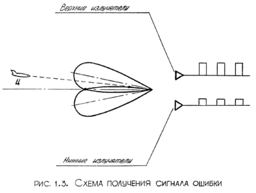Ферритовые коммутаторы осей переключают волноводный тракт таким образом, что сначала подключают к передатчику все 4 излучателя, формируя одно-лепестковую диаграмму направленности, а затем к двухканальному приемнику, то излучатели, создающие две диаграммы направленности, расположенные в вертикальной плоскости, то излучатели, создающие две диаграммы направленности в горизонтальной плоскости. С выходов приемников сигналы попадают на схему вычитания, где в зависимости от положения цели относительно равносигнального направления, образованного пересечением диаграмм направленности данной пары излучателей, вырабатывается разностный сигнал, амплитуда и полярность которого определяется положением цели в пространстве (рис. 1.3).