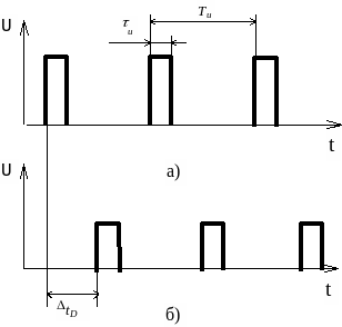 Различают РЛС импульсного и непрерывного излучения. В РЛС с непрерывным излучением используются немодулированные и ЧМ колебания. Однако наибольшее применение нашли импульсные приемопередающие радиолокационные станции, излучающие в направлении цели короткие зондирующие СВЧ-радиоимпульсы с фиксированным периодом следования, длительностью импульсов, амплитудой и несущей частотой (рис.1.1,а), что обеспечивает высокую разрешающую способность и точность при измерении дальности. Радиоприемные устройства (РПрУ) таких станций служат для приема части энергии излучаемых радиоимпульсов, отраженной от цели. Отраженные импульсы (рис.1.1,б) поступают на вход приемника с временным сдвигом DtD = 2R/c, где R – расстояние до объекта. Измеряя DtD, можно судить о расстоянии до цели, а узкая диаграмма направленности антенны позволяет определить направление на объект.