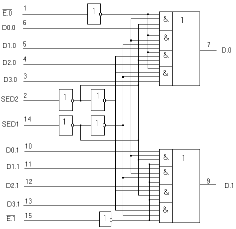 Запрещена передача информации через мультиплексор, когда он находится в невыбранном состоянии (при этом выход находится в состоянии низкого уровня). Каждый из мультиплексоров имеет по четыре информационных входа и свои стробирующие входы Е.0 и Е1. Два аресных входа SED1 и SED2 управляют одновременно двумя мультиплексорами.