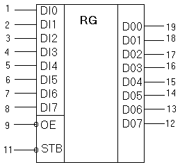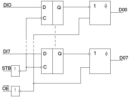 При поступлении на вход STB сигнала высокого уровня осуществляется нетактируемая передача информации от входа DI до выхода DO. При подаче на вход STB сигнала низкого уровня микросхема хранит информацию предыдущего такта; при подаче на вход STB положительного перепада импульса происходит “защелкивание” входной информации. Выходные буферы управляются сигналом ОЕ “разрешение выхода”. При поступлении на вход ОЕ сигнала высокого уровня выходные буферы переводятся в состояние “выключено”.