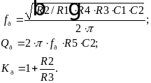 Àíàëèç ïðèâåäåííûõ âûðàæåíèé fð, Qð è Êð ïîêàçûâàåò, ÷òî ðåçîíàíñíóþ ÷àñòîòó è äîáðîòíîñòü ìîæíî ðåãóëèðîâàòü ñîîòâåòñòâåííî ðåçèñòîðàìè R4 è R5, èñêëþ÷èâ ïîäáîð íîìèíàëîâ äðóãèõ ïàññèâíûõ ýëåìåíòîâ. Ïðåäåëû ðåãóëèðîâêè ïåðâîãî ïàðàìåòðà ±400% (äàëüíåéøåå èõ ðàñøèðåíèå ìîæåò ïîâëå÷ü çà ñîáîé ñàìîâîçáóæäåíèå ôèëüòðà íà ðåçîíàíñíîé ÷àñòîòå), âòîðîãî - 0...20 (âåðõíåå çíà÷åíèå îãðàíè÷åíî âõîäíûì ñîïðîòèâëåíèåì ÎÓ).