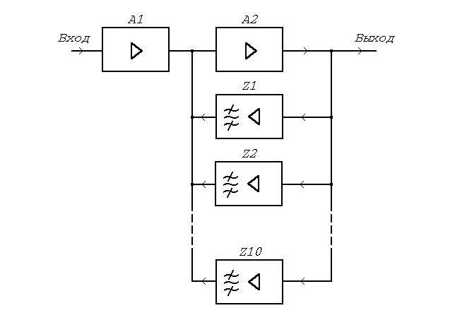Òàêèì îáðàçîì, âûáðàíà ñòðóêòóðíàÿ ñõåìà: äåñÿòèïîëîñíàÿ ñ ôèëüòðàìè â öåïè îáðàòíîé ñâÿçè è áóôôåðíûì êàñêàäîì íà âõîäå.