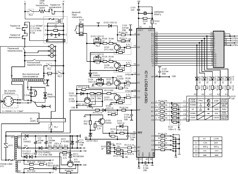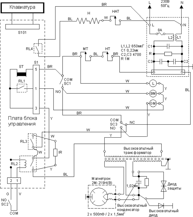 Чаще всего выходит из строя высоковольтный диод, реже выходит из строя магнетрон. Не на последнем месте слюдяная прокладка. При ремонте проверьте наличие напряжения питания магнетрона -2500 -3500V. На магнетрон приходят 2 силовых провода для подачи напряжения на (катод) и накала.