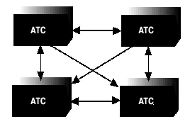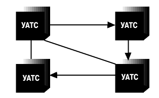 При взаимной синхронизации информация о синхронизации совместно используется всеми узлами сети (рис.7). Каждый генератор посылает и принимает сигналы эталонной синхронизации на все другие генераторы в сети. Синхронизация цепи определяется путем усреднения всех сигналов синхронизации, получаемых каждым генератором от всех других генераторов в сети. Теоретически, эта работа может обеспечить идентичные сигналы синхронизации на каждый узел, но в реальных условиях, при наличии несовершенных генераторов и несовершенной передачи информации о синхронизации, синхронизация подвержена флуктуации и стремится к общей частоте.