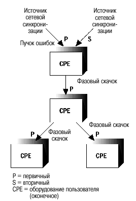 Когда генератор слоя 4 подвергается кратковременному прерыванию, он сигнализирует о невозможности использования эталонного сигнала и переключает эталонный сигнал на запасной источник синхронизации. Этот запасной источник может быть либо другим эталонным сигналом синхронизации, либо его внутренним генератором. Во время этого переключения генератор обычно будет выдавать большой, быстрый фазовый скачок длительностью 10-1000 мксек. Этот фазовый скачок возникает на всех исходящих линиях СРЕ.