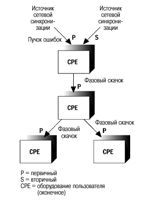 В частных сетях синхронизация может вызвать дополнительные сбои (ухудшения) в форме пакетов ошибок. Рассмотрим частную сеть, в которой тактовые генераторы оборудования, размещенного на территории пользователя (СРЕ), соединены в цепь. Кратковременному ухудшение опорной частоты первого СРЕ повлияет на работу всего оборудования в цепи (см. Рис.3). В ответ на кратковременную ошибку большинство генераторов CPE выработает пакеты ошибок на всех выходных линиях. Второй генератор в цепи определит наличие ухудшения, вызванного первым генератором, и будет реагировать подобным образом, вырабатывая ухудшения (сбои) на всех своих выходах. Таким образом, пучок ошибок распространяется (и произвольно увеличивается) по всей сети СРЕ.