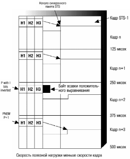 С появлением SDH к сетям синхронизации предъявляются новые требования. SDH являются высокоскоростными синхронными транспортными системами. Элементы сетей SDH требуют синхронизации, так как передаваемый ими оптический сигнал является синхронным. Однако потеря синхронизации сетевыми элементами SDH не приводят к возникновению проскальзываний. Это обусловлено тем фактом, что рабочая нагрузка в SDH передается асинхронно. Для идентификации начала кадра SDH используют указатели. Несовпадение скоростей передачи и приема вызовет изменения в указателе (см. Рис.2).