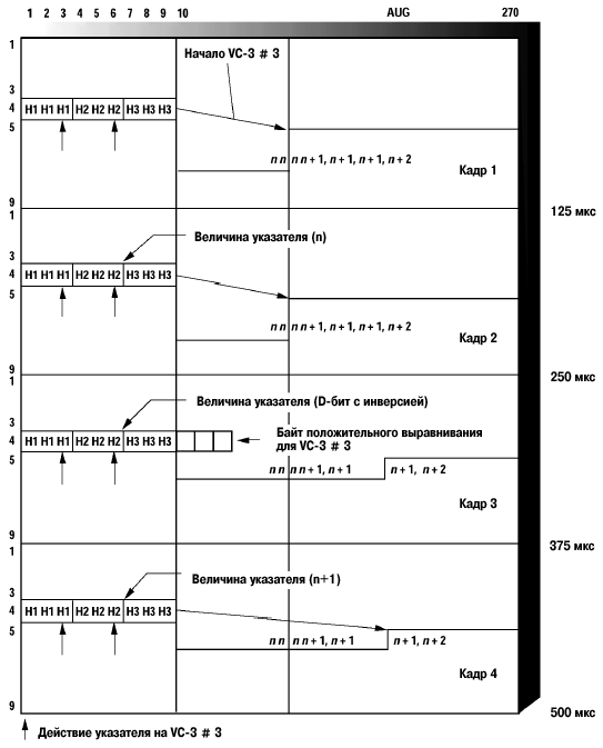 Разность фаз и частот между двумя сетевыми элементами (NE) в SDH может быть компенсирована с помощью указателей полезной нагрузки. Если передающий NE SDH работает быстрее приемного, последний будет создавать отрицательное выравнивание указателя и сдвигать полезную нагрузку вперед на один байт или восемь бит, как показано на рисунке 8(a). Таким образом приемный NE будет подстраиваться под передающий без потери информации. Аналогично, если передающий NE более медленный, чем приемный, возникнет положительное выравнивание указателя на один байт, как показано на рисунке 8(б).